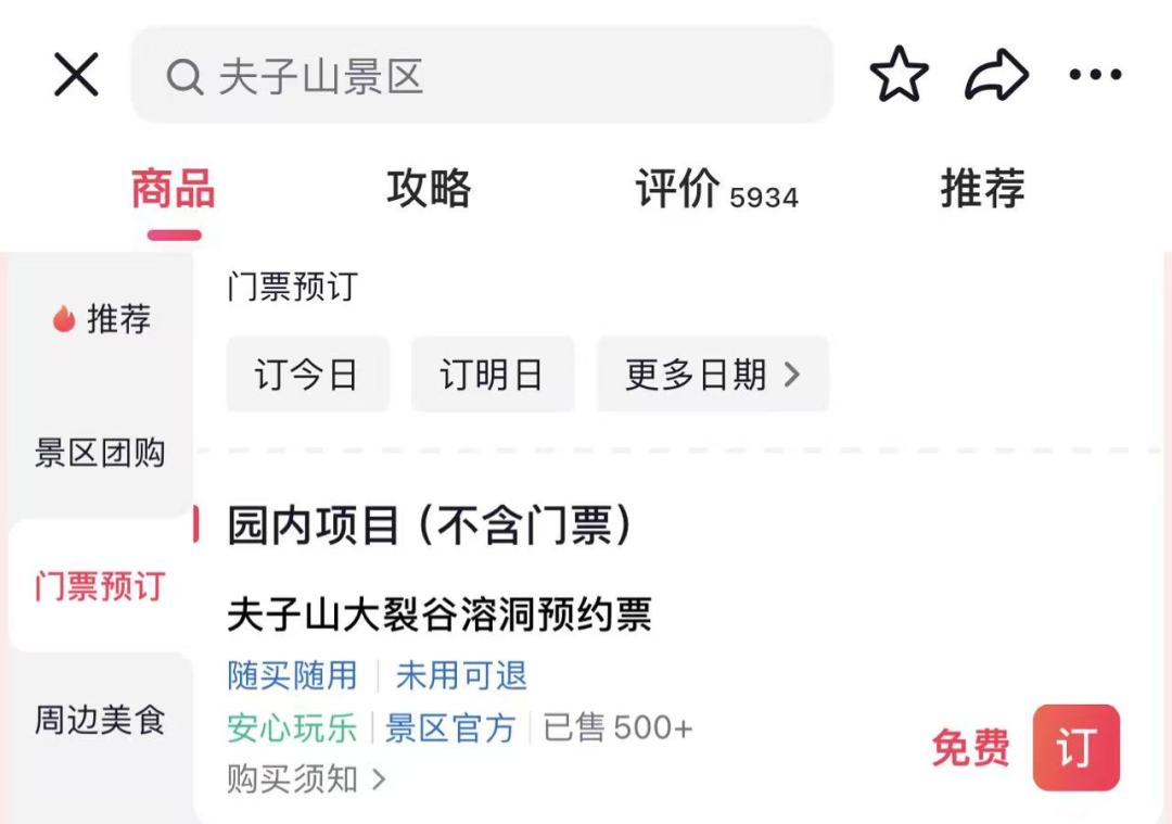 为了给游客提供更优质的游览体验,夫子山大裂谷(溶洞)实行免费分时预约制。游客朋友们只需在美团或抖音上搜索“夫子山景区”,点击进入门票预定页面,找到“夫子山大裂谷(溶洞)门票预约”选项,根据自己的游玩时间,轻松预约合适的时间段,即可开启这场奇妙之旅。