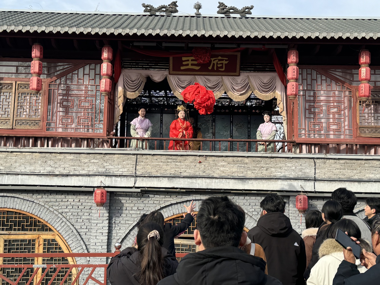 随后,来到王府广场,一场别开生面的游客互动演出《王府招婿》正在上演。积极参与其中,说不定幸运的绣球就会落入您怀中,让您体验一把迎娶“王府千金”的奇妙感觉,感受古代婚俗的独特魅力。