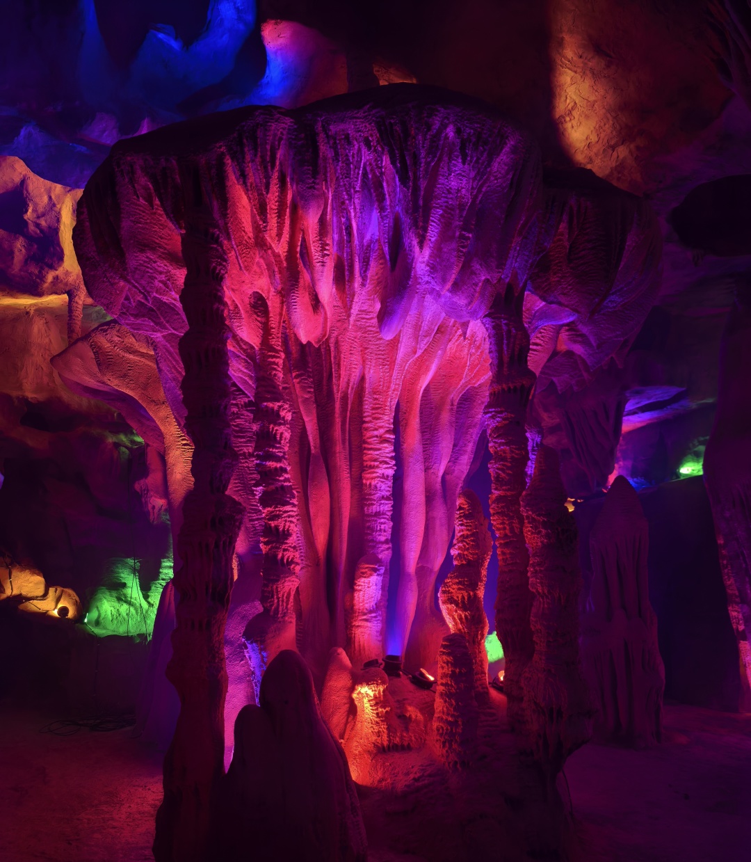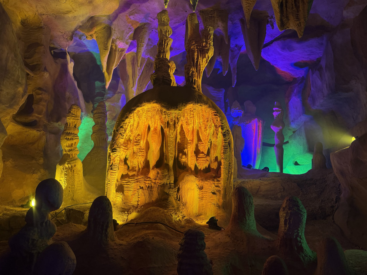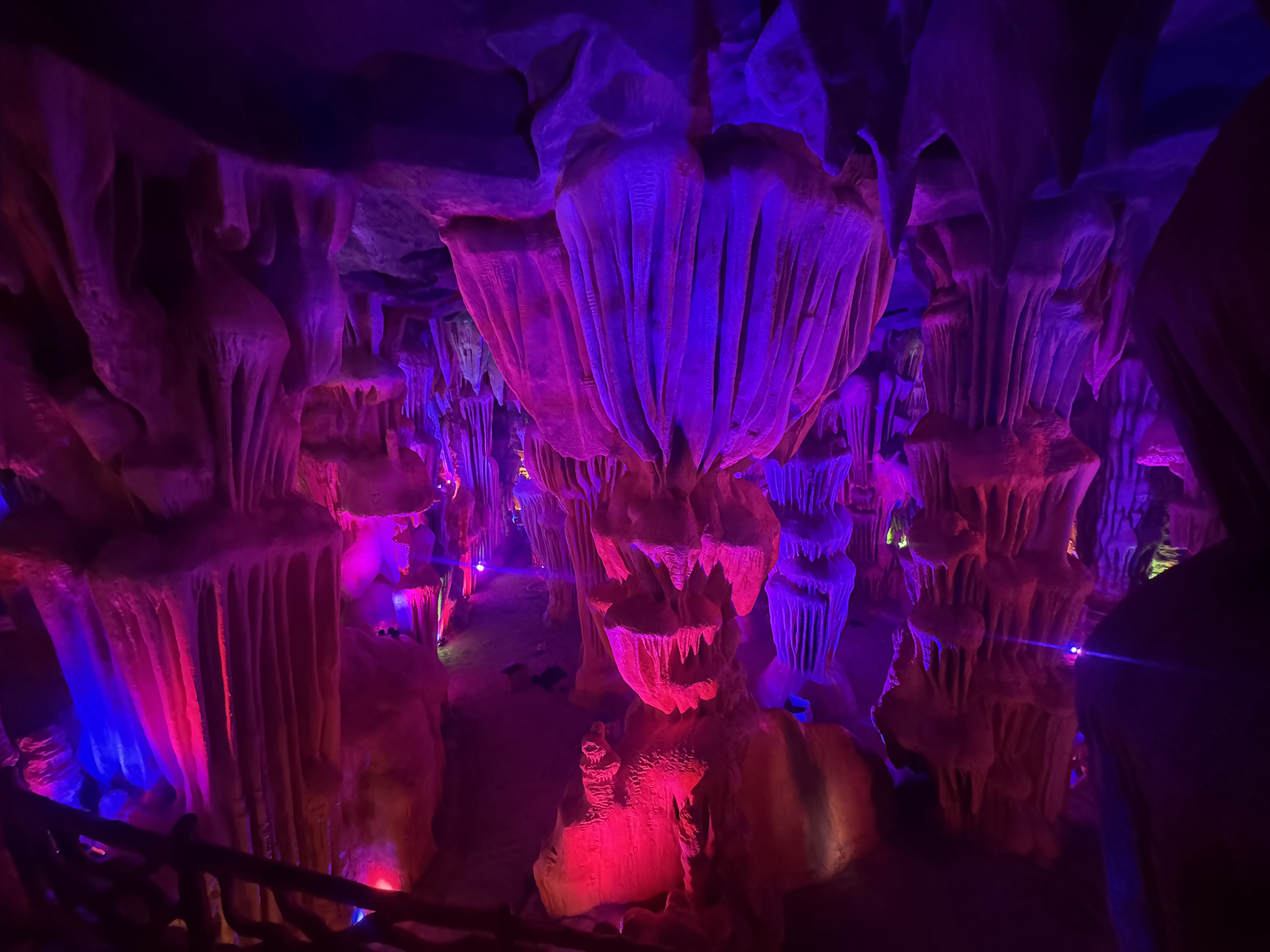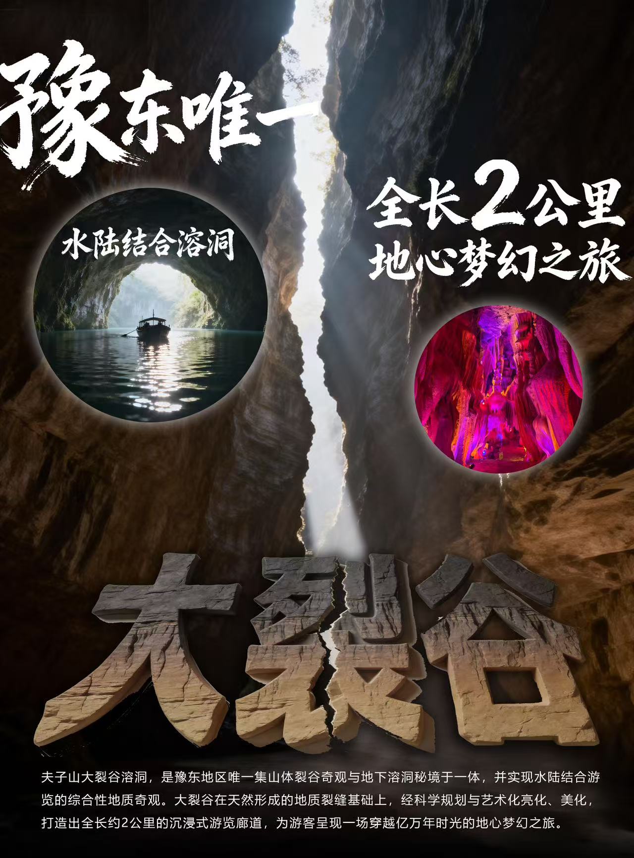 看完精彩演出,前往马站后侧的夫子山大裂谷(溶洞)。这里采用水陆结合的游玩形式,游客朋友们先乘船进入峡谷,在暗道中悠然行船,感受水流的潺潺与峡谷的幽深。抵达溶洞后,上岸便能看到各种各样形态各异的钟乳石和石笋,它们在灯光的映照下,宛如梦幻的童话世界,让人不禁感叹大自然的鬼斧神工。从溶洞出来,便是一线天景观。狭窄的通道仅容一人通过,恰似陶渊明在《桃花源记》中所描述的“初极狭,才通人”,置身其中,更能深刻感受大自然的神奇造化。