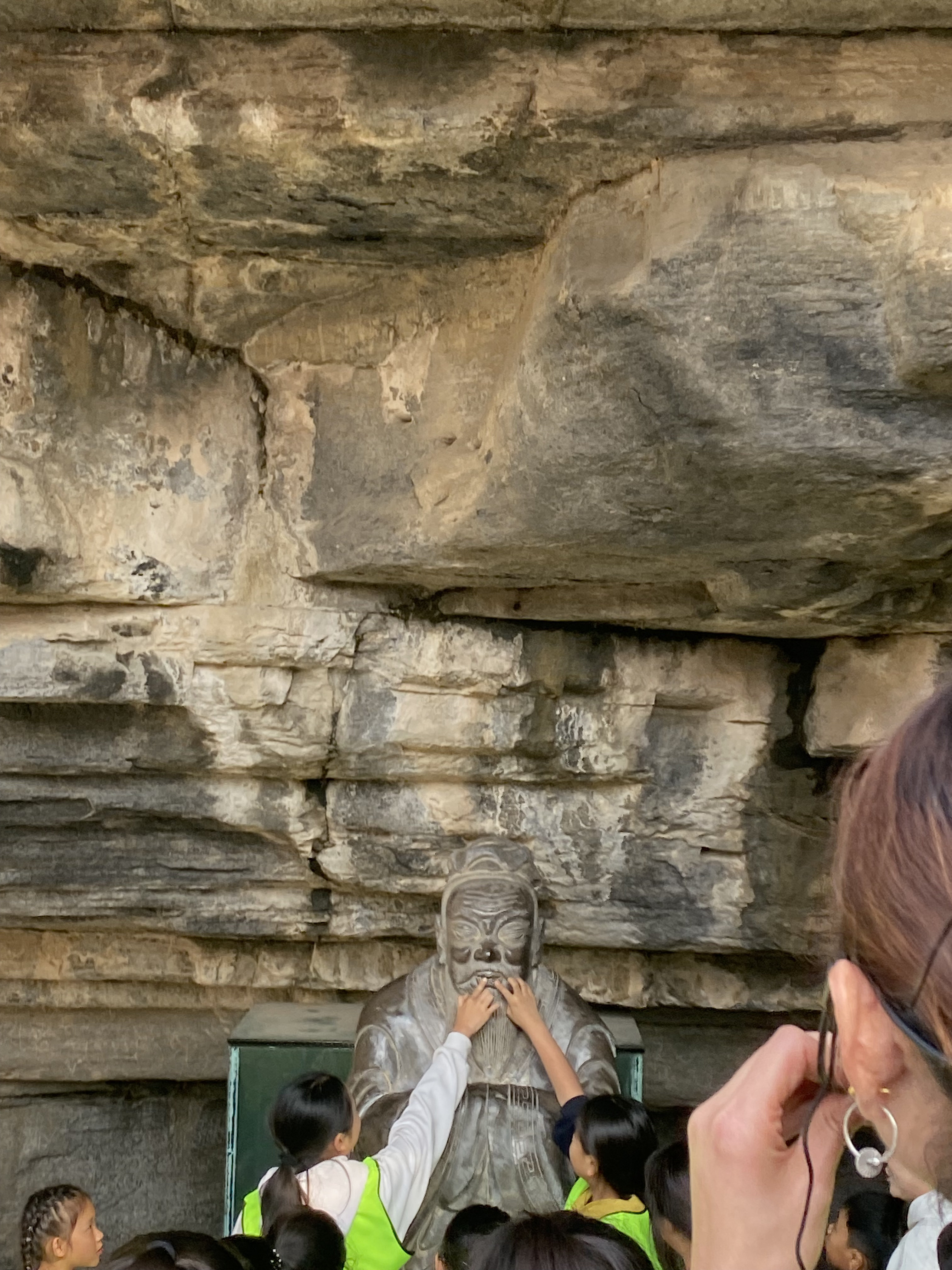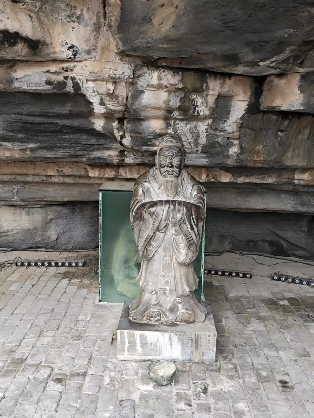 走进崖洞,一尊被玻璃罩精心保护的孔子石像静立其中。这尊雕像制作于明代,至今已有数百年历史。